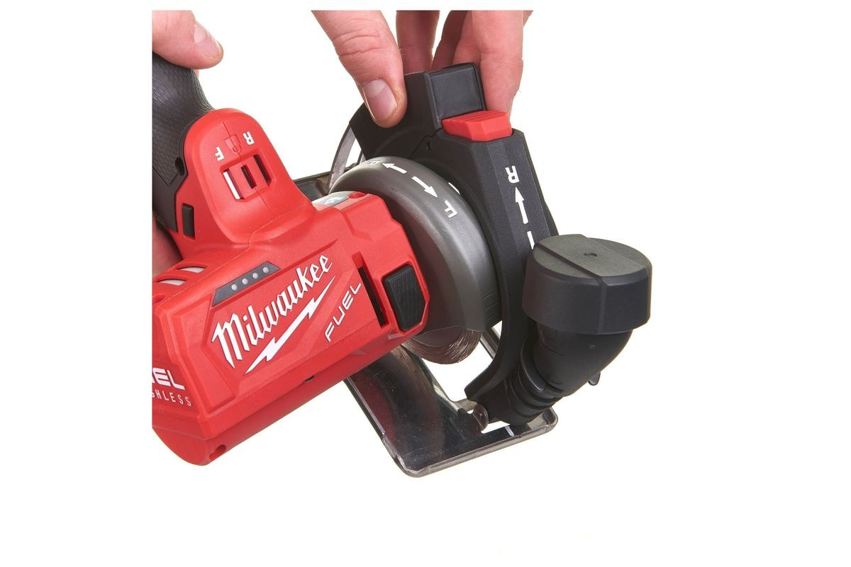 • Enostavno nastavljiv zaščitni ščitnik in edinstvena možnost izbire smeri vrtenja rezila (naprej/nazaj) za zaščito uporabnika pred odpadnim materialom v različnih položajih rezanja.